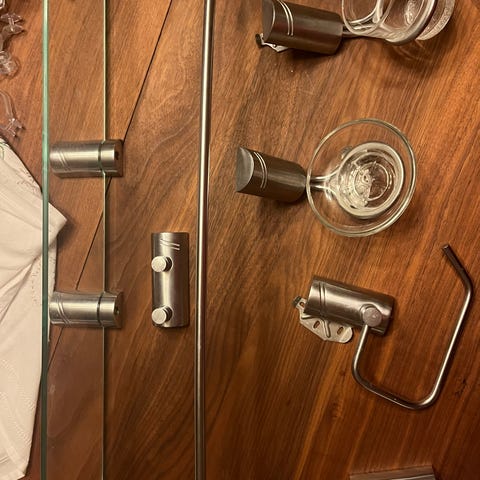 Set från Miller med badrumstillbehör bestående av en väggmonterad glashylla med kromade fästen samt två väggmonterade hållare med vita koppar/behållare i keramik och dubbelhållare till handdukar. Samtliga delar är i kromfärgad metall med rundade väggfästen. Avsett för montering på vägg i badrum för förvaring av exempelvis hygienartiklar, tandborstar, handdukar och toalettborste.
