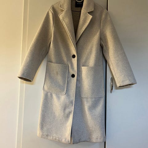 H&M kappa för dam i storlek 36. Lång modell i beige färg med klassisk krage och slag. Tillverkad i polyester med slät yta och fodrad insida. Kappan har knäppning framtill och markerad midja med sömmar i sidorna. Passar som ytterplagg under svalare väder.