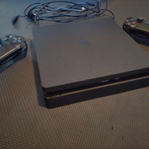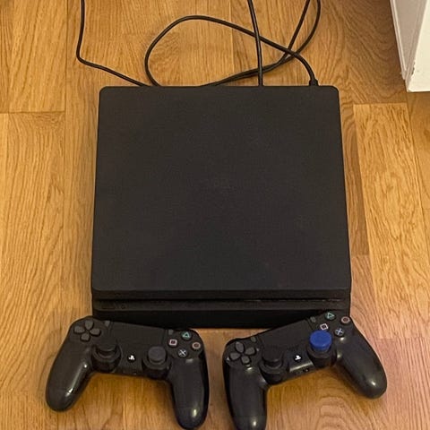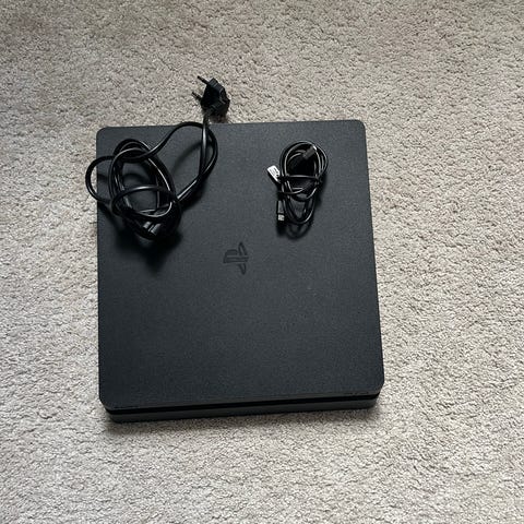En Playstation 4 med två handkontroller samt strömkabel för konsolen och en lång laddkabel för en handkontroll.