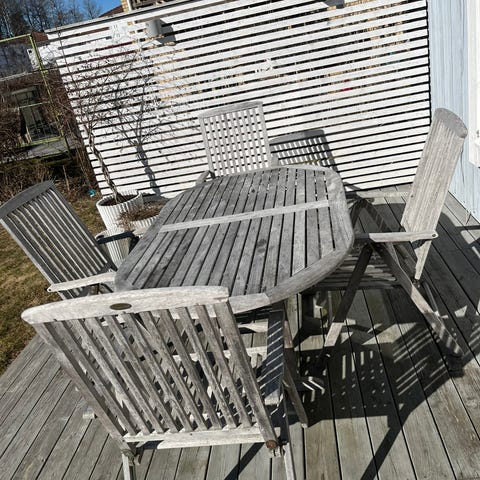 Säljer en stadig och rejäl matgrupp i trä – perfekt för altan, balkong eller uteplats.