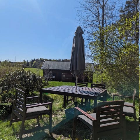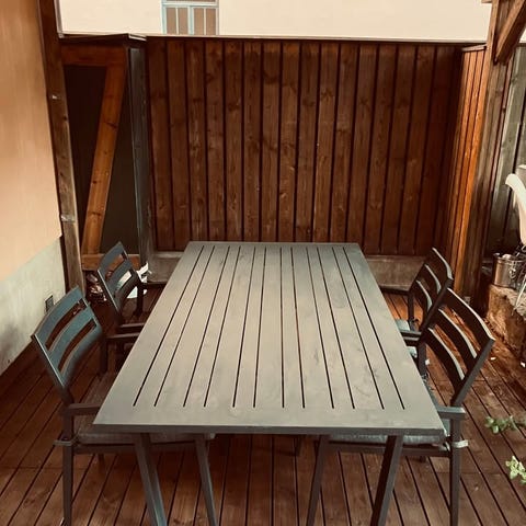Stabilt & gediget trädgårdsbord med 5 ställbara stolar