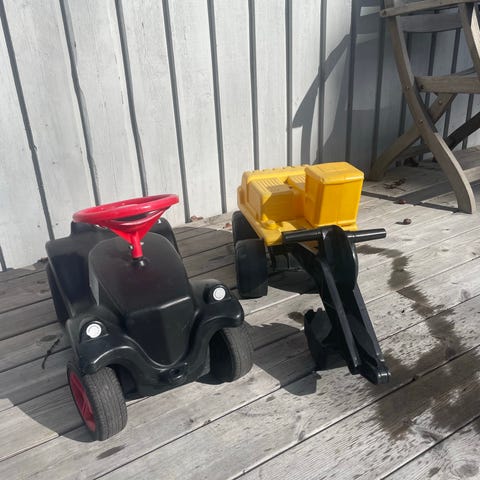 Bobcart bil med släp åkfordon i plast i färgerna blå och rosa. Åkfordonen är utformade för små barn att sitta på och ta sig fram genom att sparka med fötterna. Båda har fyra hjul och ett enkelt styrhandtag eller ratt framtill. Passar för inomhusbruk eller på plana ytor utomhus.
