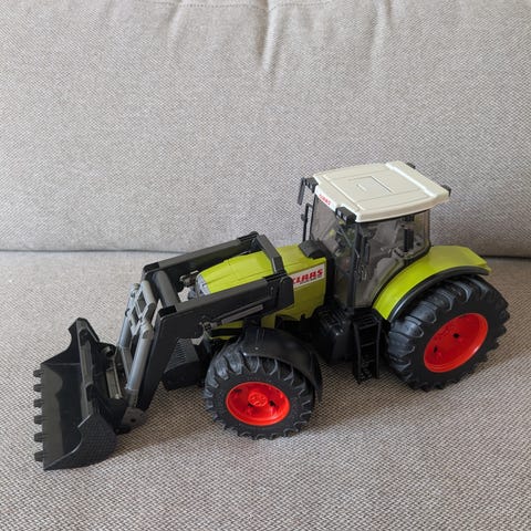 Denna leksak är en New-Ray RZ-1 lantbrukstraktor med frontlastare. Den har en grön plastkonstruktion med en frontgrävare/skovel. Innehåller en bondefigur. Materialet är plast. Den har 2 mindre skador som syns på bilderna. Längd ca 19 cm. Bredd ca 7,5 cm. Höjd ca 9 cm.
