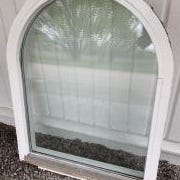 Halvmåneformat träfönster med glas i vit kulör. Fönstret har båge och karm i trä med utsida i trästruktur och insida målad i vitt. Passar exempelvis som överfönster eller dekorativt inslag i vägg eller fasad där ett rundat fönster önskas. Kan användas både i uterum och bostadsutrymmen beroende på montering och tätning.