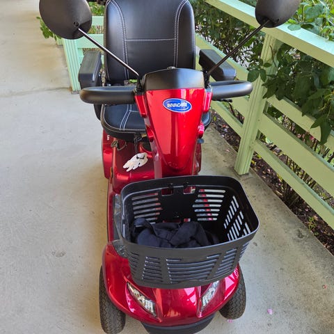 Elegant elskoter trehjuling i röd färg. Modellen har tre hjul för ökad stabilitet, bekväm sits med armstöd och fotplatta för enkel på- och avstigning. Utrustad med backspeglar, belysning fram och bak samt digital display som visar hastighet och batteristatus. Bak finns en låsbar förvaringsbox och hållare för tillbehör. Elskotern är lämplig för kortare transporter och vardagsärenden på jämnt underlag.