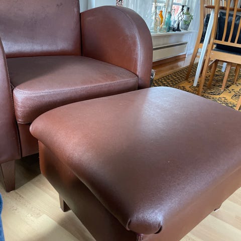 Fåtölj med fotpall i mycket bra skick. Har inte använts så mycket för att sitta i, så välbevarad. Färg mörkbrun/oxblod, konstläder.