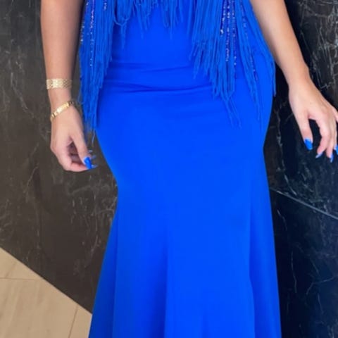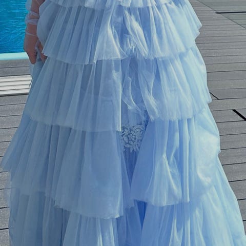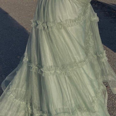 festklänning i storlek S. Klänningen är gul och köpt i Istanbul för 5000 kronor. Modellen har flera volanglager i kjolen och plisserade detaljer. Avsedd som festklänning för dam.
