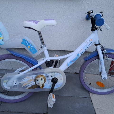 Crescent barncykel med 16" hjul. Cykeln har blå ram med fotbroms bak och handbroms fram. Gott skick, cykelkorgen är lite bucklig.