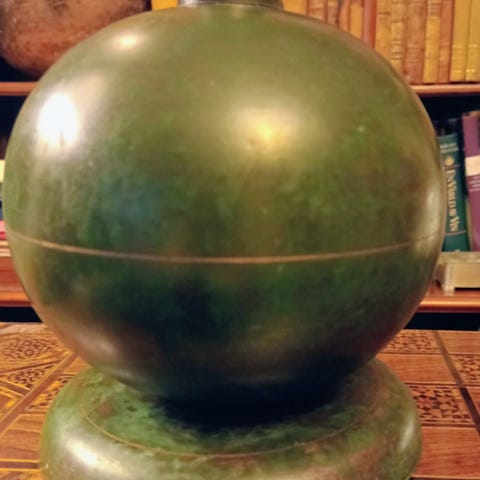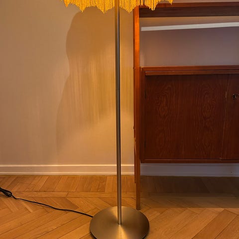 Stor golvlampa i Art Deco-stil med stark visuell närvaro. Benämnd “Halo” enligt kvitto.