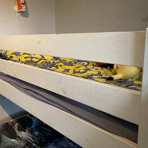 Mio familjesäng/ våningssäng . På överslagen passar madrass med måtten 90x200 och underslafen är 120x200. Lite sliten men robust och stabil. Madrasser ingår.