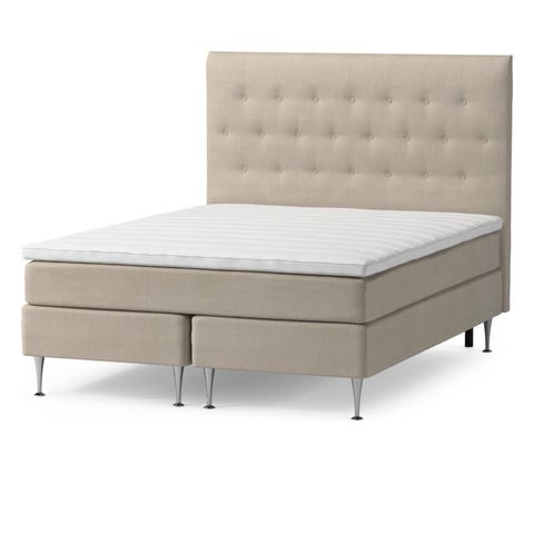 Säljer en stilren och bekväm kontinentalsäng från Roma Family i beige tyg (Noel beige). Svensktillverkad modell med bra komfort och stabil konstruktion. Silvriga ben.