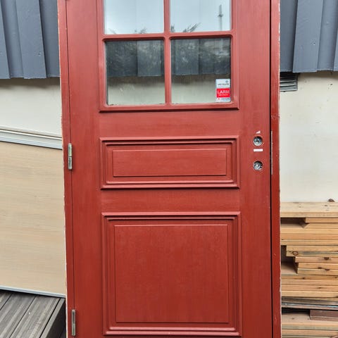 Ytterdörr med karm i svart färg . Dörren levereras tillsammans med tillhörande karm, som syns på bilden. Passar exempelvis till förråd, bod eller annan byggnad där en robust dörr med sparkplåt önskas.