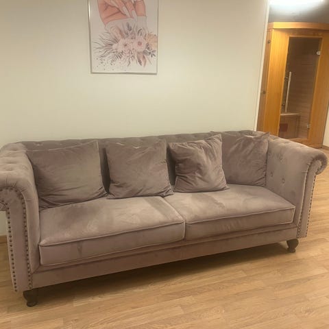 En bra och bekväm soffa. Finns 2 st 3-set och en fåtölj, allt i sammet. Inga skrapmärken/märken, nästan som ny.
