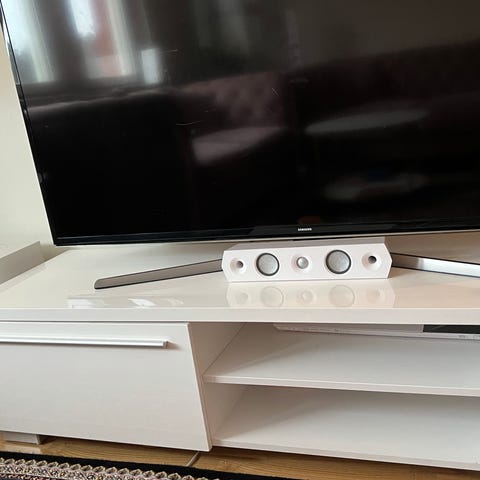 Säljer en vit tv-bänk/sideboard i bra skick. Den har ett dörrsegment med hylla samt ett öppet hyllsegment med mittdelare – praktisk och stilren design som passar de flesta hem.