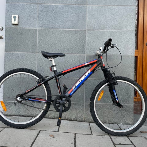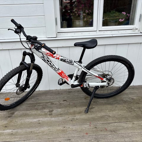 Haro barncykel med 24" hjul i röd och vit färg. Cykeln har framgaffel med fjädring
