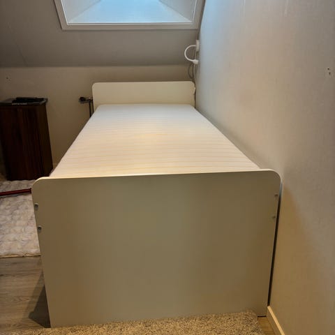 Sängen är i bra skick, stabil och robust konstruktion – perfekt för att frigöra golvyta i rummet.