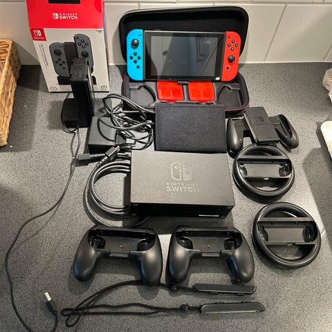 Nintendo Switch spelkonsol med Joy-Con‑handkontroller i neon röd/blå. Konsolen kommer med dockningsstation, nätadapter och kablar enligt bild. Ett fodral för förvaring och transport ingår.