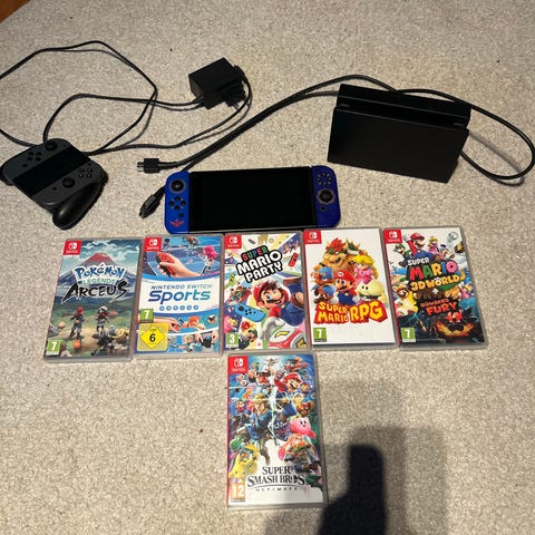Flera Nintendo Switch‑spel ingår enligt bilderna, bland annat bilspel, fotbollsspel och ett träningsspel. Spelen levereras i sina fodral med spelkassetter.