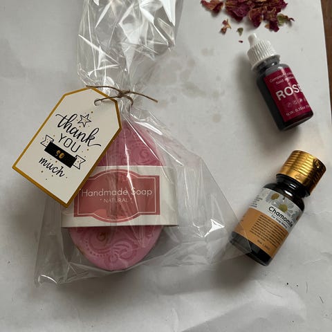 Ljusblå handtvål med lukt av lavendel 2 st. Kommer i en genomskinlig plastpåse. Ena bara ljusblå andra hälften mörk och hälften ljus. Passar för hela familjen.