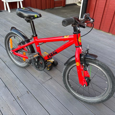 Frog 44 barncykel med 16" hjul. Utrustad med reflexer, ringklocka, skärmar och grovmönstrade däck som ger bra grepp. Passar som första större cykel för barn som vuxit ur balanscykel eller mindre hjulstorlek.