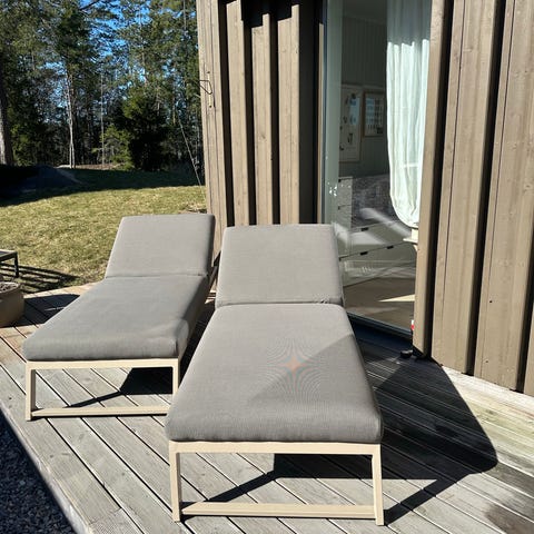 Solsängar i kombination av teak och rostfritt stål. Ryggstöden är ställbara för olika lutningslägen. Passar för användning utomhus på altan, terrass, brygga eller vid pool. Design med ribbor ger bra avrinning av vatten och luftig sitt- och liggyta.