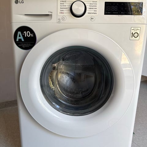 LG kombinerad tvättmaskin/torktumlare i vit färg. Mycket sparsamt använt. Frontmatad modell med digital display och programvred på frontpanelen. Maskinen har glaslucka och flera valbara tvätt- och torkprogram som visas på panelen. Lämplig för hushåll som vill kombinera tvätt och tork i en och samma maskin för att spara utrymme. Kan styras digitalt via app.
