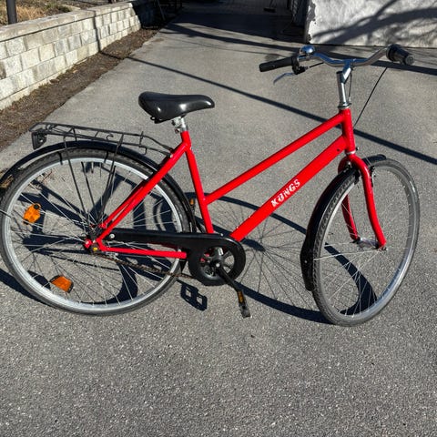 Barncykel med 24" hjul i röd färg. Cykeln har lågt insteg, pakethållare bak, stänkskärmar och reflexer. Utrustad med upprätt styre och sadel anpassad för barn/ungdom. Lämplig för vardagscykling och kortare turer.