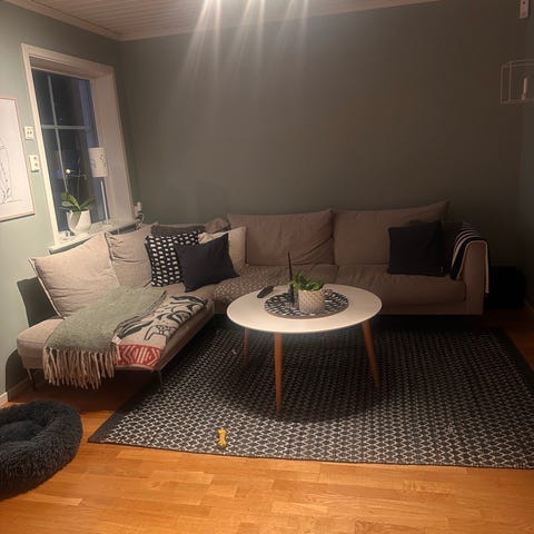 Mio hörnsoffa i grått tyg. Soffan har L‑formad utformning med divanliknande avslutning på ena sidan och raka sittplatser på den andra. Rygg- och sittkuddar är lösa och klädda i samma tyg som stommen. Passar för vardagsrum och sällskapsytor med behov av flera sittplatser. Placeras med fördel mot vägg eller i ett hörn för att utnyttja rumsytan effektivt.