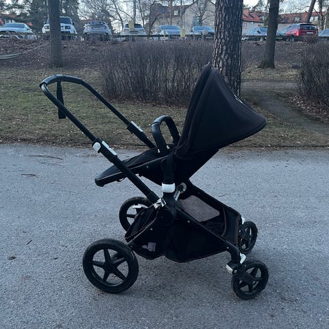 Bugaboo barnvagn ligg och sottdel i svart tyg med aluminiumchassi. Vagnen har svängbara framhjul och större bakhjul med vit kant, rymlig varukorg undertill samt justerbart handtag. Sittdelen är utrustad med fempunktssele, bygel och sufflett. Den har en funktion som man kan använda i trappor som är super smidig! Det medföljer även liggdel vagnen är bara använd ett par månader och är i toppenskick! Det medföljer även ett regnskydd, myggnät och två däckskydd