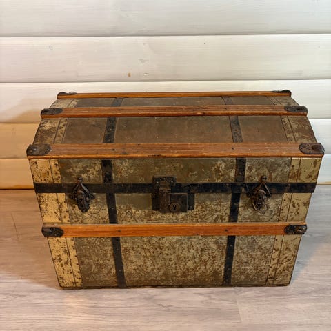 Resväska koffert i trä med förstärkningar och detaljer i metall. Ytan är brun med träslåar och metallbeslag runt om, inklusive låsbeslag på framsidan. Invändigt är kofferten klädd med mönstrat tyg. Passar som förvaring eller inredningsdetalj i hemmet. Bärhandtag finns på sidorna för enklare förflyttning.