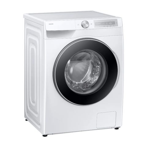 Samsung frontmatad tvättmaskin i vit färg. Maskinen har en frontlucka med runt glasfönster och tydlig digital display med vred för programval. Avsedd för installation i hushåll, lämplig för tvätt av vanliga textilier som bomull, syntet och blandmaterial. Utrustad med flera programval och inställningar via panelen på ovansidan framtill. Passar för placering fristående i badrum, tvättstuga eller annat utrymme med vatten- och avloppsanslutning.