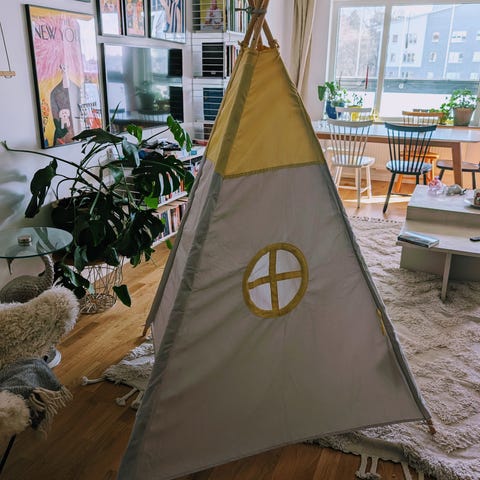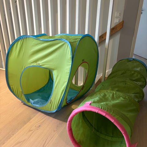 Lektält i vitt. Har använts som ett ställe att läsa barnböcker tillsammans. Har två stora fack till böcker på insidan av tältet. Insåg nu att jag har monterat upp tältet ut och in.