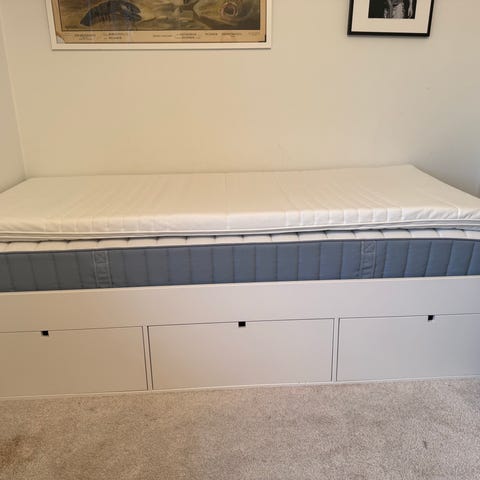 I väldigt gott nytt skick använd som extrasäng/gästsäng. Alltid använt madrasskydd och toppmadrass på sängen (de ingår ej)