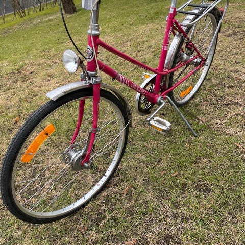Robust modell med lågt insteg och breda 26 tums däck. Vacker röd lack, fot- och handbroms, inga växlar (1-växlad, singel speed), ringklocka, cykelstöd och cykelkorg. Väldigt sparsamt använd, mycket fint skick.