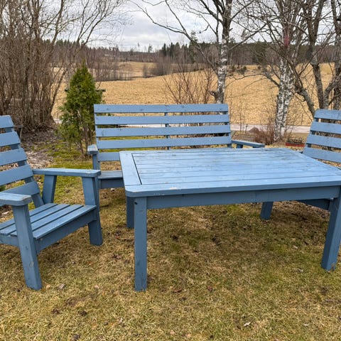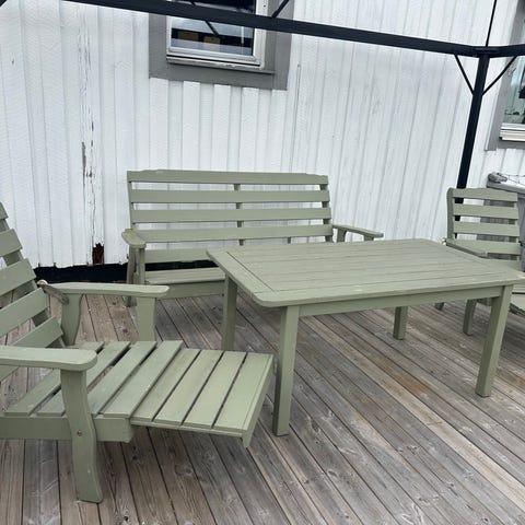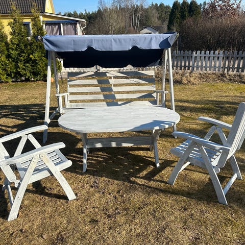 Trädgårdsgrupp trä bord soffa och fåtöljer vit Säljes