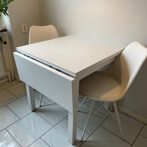 Minde köksbord som går att fälla upp båda sidorna på. Ca 117*78 helt utfälld och 58*78 outfällt. Är plastfolie på bordsskivan och benen vitmålade. Hämtas I hässleholm