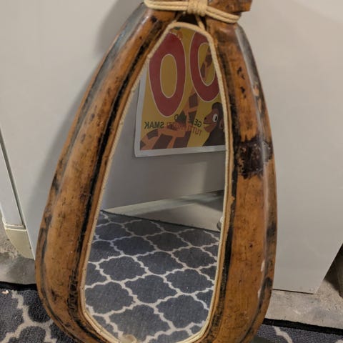 Fin antik lyrformad spegel i svart och guld, för skick och mått se bilder.