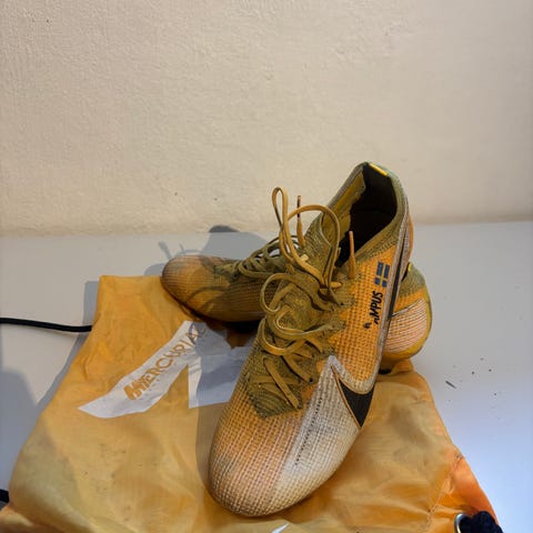 Gröna Nike mercurial superfly elite. Har använt de ett tag nu men är fortfarande i väldigt bra skick. Det finns två jättesmå hål som inte syns vid strumpan men kan bli större, skosnören finns (se bilder). Storlek: 44. Hör av dig vid frågor eller intresse!