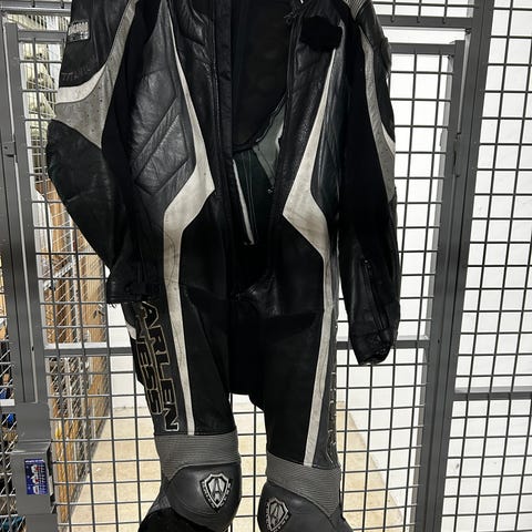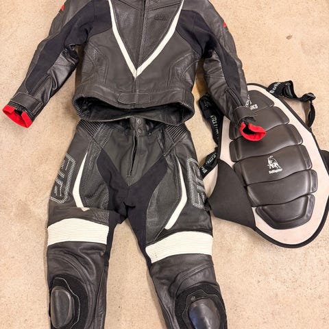 Rejält MC-ställ i skinn med skydd på axlar, armbågar och knän – perfekt för både gata och bana.