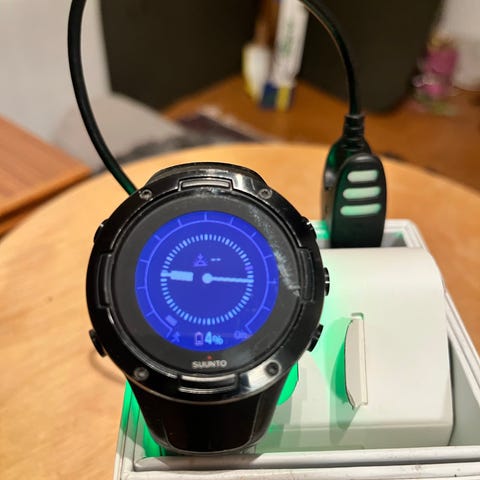 Suunto 7 smartwatch med svart silikonarmband. Klockan har rund urtavla och pekskärm. Levereras med originalförpackning och Suunto-laddkabel med USB-anslutning. Passar för användning vid vardag och träning, med funktioner typiska för smartklockor som notifieringar och aktivitetsmätning beroende på konfiguration och ansluten mobiltelefon.