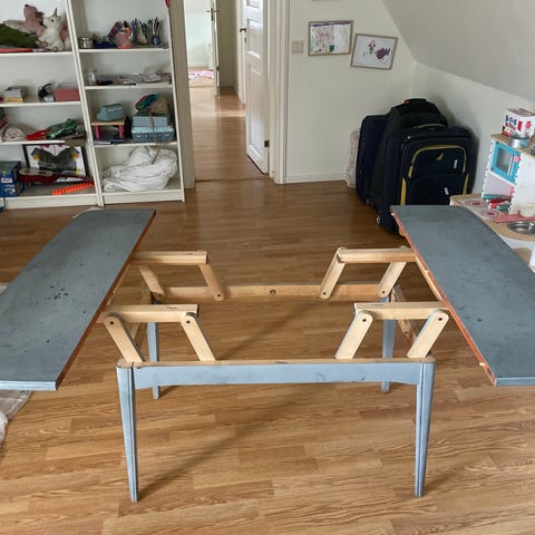 Bänken är i använt skick och har en del slitage. Den har tyvärr blivit sågad lite i (se bild 3)
