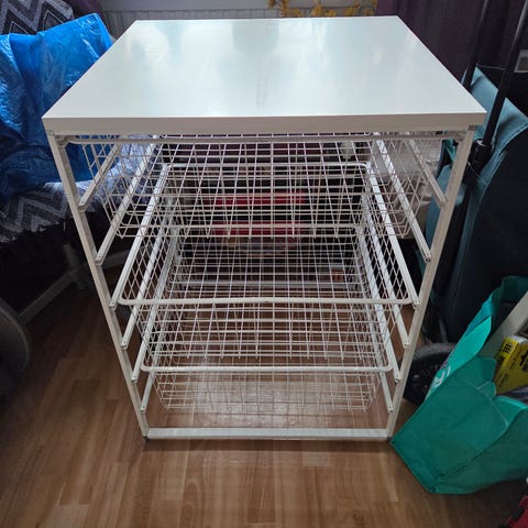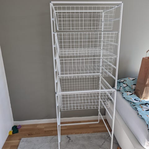 Förvaringsställ med 2 djupa korgar och 3 låga + 1 hyllplan. Mått inkl ställning.