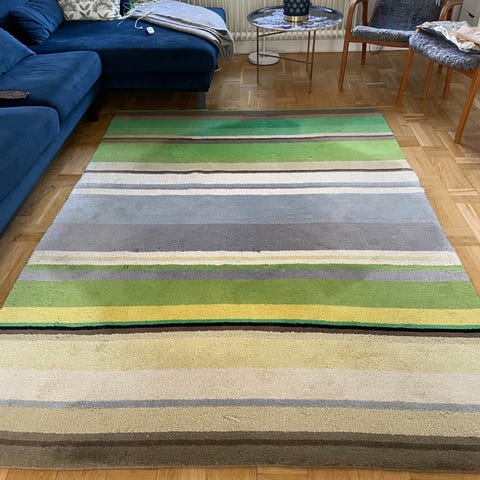H&M Home ullmatta med rektangulärt mönster i olika fält av slätvävd och lurvig struktur. Färgen är ljus beige/offwhite. Mattan passar exempelvis i vardagsrum, sovrum eller hall och ger en kombination av slät och mjuk yta under fötterna. Materialet består av vävd bas med inslag av längre lugg i markerade partier. Nyligen tvättat, rök och djurfritt hushåll.
