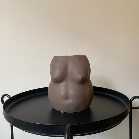 Skulptur i sten föreställande en sittande figur på sockel. Skulpturen har en mörk, melerad yta och är utformad i stiliserad, abstrakt form. Passar som inredningsdetalj på bord, hylla eller piedestal i hem- eller kontorsmiljö.