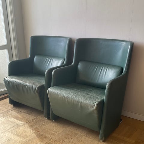 Säljer 2 st svarta skinnfåtöljer. Har stått i ett kontorsrum flera år så i gott skick om än med några år på nacken. Sköna att sitta i!