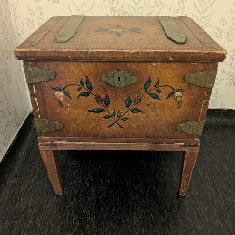Träskrin med lock i brunlaserat trä. Rektangulär form med gångjärn i metall och förstärkta hörn undertill. Framsidan är dekorerad med målad text och årtalet 1791. Passar för förvaring av mindre föremål eller som inredningsdetalj. Bredd 40 cm, djup 30 cm och höjd 17 cm.