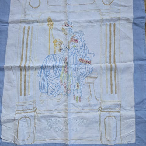 Emad papyrustavla med faraomotiv i blå/silver toner. Handmålad bild på äkta papyrus, signerad av konstnären Emad. Tavlan visar ett stiliserat porträtt av en farao med traditionell huvudbonad och dekorativa detaljer runtomkring. Baksidan har stämpel som intygar att materialet är äkta papyrus. Passar som väggdekoration i hem eller kontor, och kan ramas in efter önskemål. 62 x 95 cm.