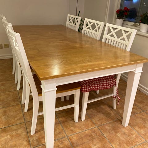 Vi har slipat och betsat ovansidan och resten har vi målat vit men skulle behövas något till lager färg därav priset!