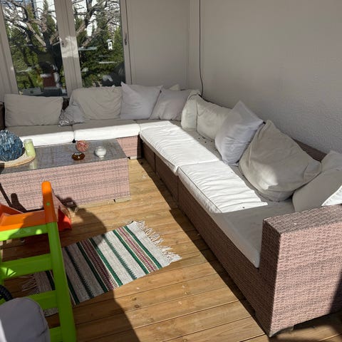 Hörnsoffa för utomhusbruk med flera moduler och svarta dynor. Soffan består av sektioner som kan ställas ihop till en hörnsoffa. Medföljer gör ett lågt soffbord med glasbordsskiva. Passar för uteplats, balkong eller altan som sittgrupp för flera personer. Konstrottingen är som nu. Dynorna är solblekta.