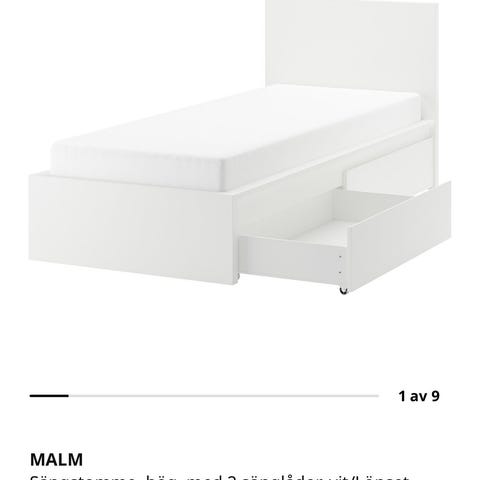 IKEA MALM sängstomme med förvaring i vit färg. Sängstommen har två utdragbara lådor som ger extra förvaringsutrymme. Enkel, rak design som kan kombineras med olika typer av inredningsstilar i sovrum.